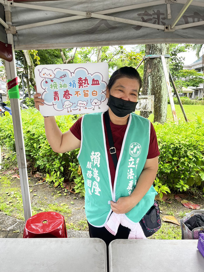 立法委員賴瑞隆服務處溫夏玉小姐全程投入志工服務,於現場熱情招呼捐血人。