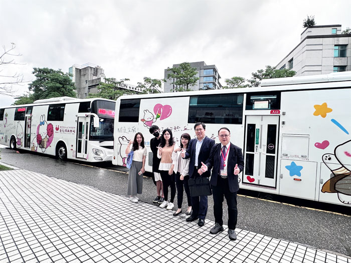 細雨灑在台北捐血中心的午後,空氣有點濕冷,但門口停著的兩輛大型電動捐血車,卻讓整個現場亮了起來。車身的設計簡潔又可愛,乍看還以為是哪個品牌推出的新車亮相活動,也大量吸引了許多路人的目光。