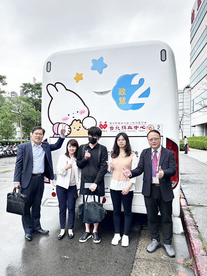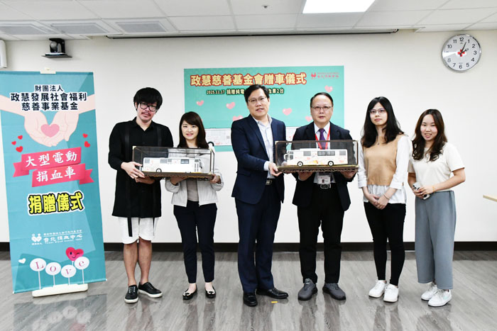 政慧1號、2號捐贈儀式,台北捐血中心主任林敏昌(右3)邀請政慧基金會代表王嘉瑋董事長(左3)、執行秘書洪詩淳(左2)、行政組長林曼琳(右2)及車身視覺設計者侯孝哲(左1)共同見證這個難得的時刻,同時也感謝政慧基金會的捐贈,讓台北捐血中心未來採血的工作能更加順利。