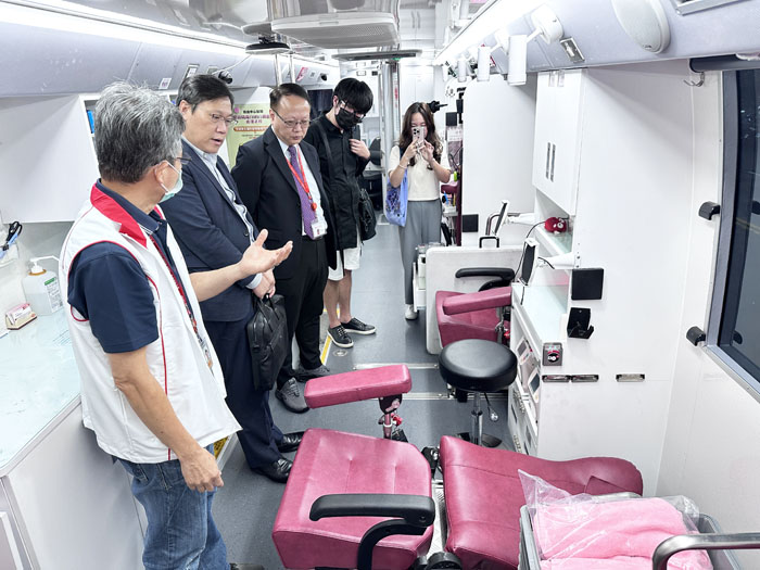 在參觀的過程,王嘉瑋董事長發現到許多小細節,例如每個座位旁都有飲料架,這是因應現在大家經常人手一杯飲料,為了方便捐血人放置而特別裝設的。他非常期待政慧1號、2號能被善用,深入更多地區,完成它慈善公益的任務使命;並且和洪執行秘書分享了一個想法:未來辦理捐血活動時,能推出兔兔主題的贈品,讓公益更有趣、更吸引人。