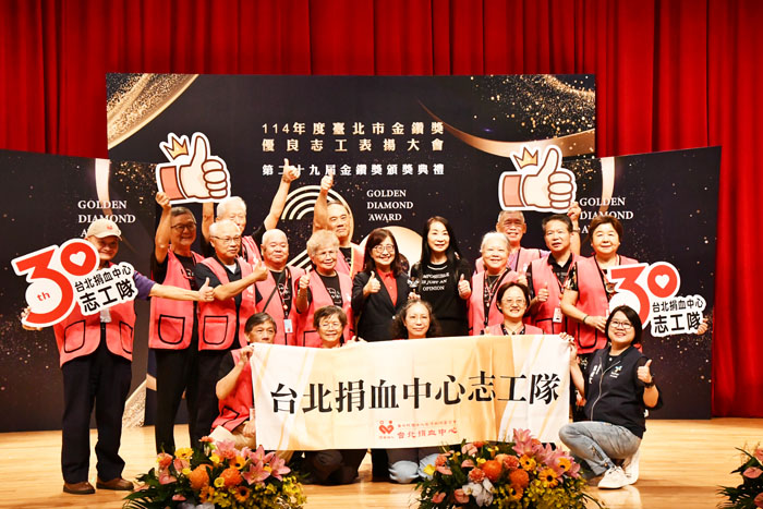 台北捐血中心志工隊榮獲第29屆金鑽獎「優良志工團隊」殊榮,今年適逢志工隊成立30週年,此次獲獎更具象徵意義,肯定我們多年來在捐血服務推廣及捐血人關懷上的成果。頒獎典禮於114年11月16日在台北市中油大樓國光廳盛大舉行,「優良志工團隊金鑽獎」由台北市副市長林奕華頒贈、志工隊長房冠寶代表受贈。