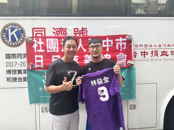 職棒球星林益全(右)親自捐血響應公益,呼籲球迷共同挽袖做愛心。