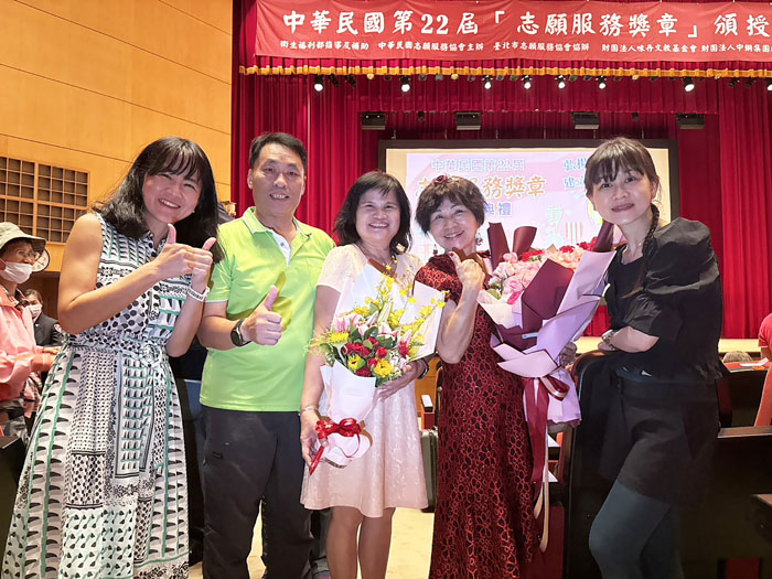 因為捐血,趙蔡瓊花(右二)開啟志工生涯,獲得第22屆「二等志願服務獎章」肯定。