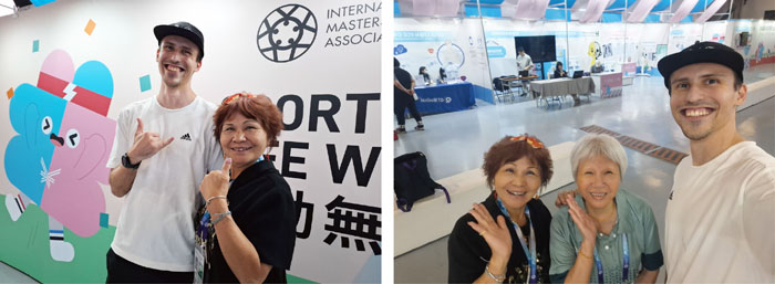 在世壯運擔任活動引導志工時,趙蔡瓊花和熱情的外國選手相談甚歡,開心合影留念。