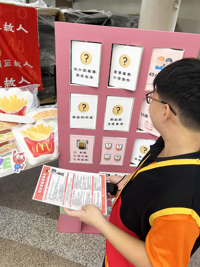 活動中,有一幕讓人至今難忘。一位身體外觀有些殘缺的學生,慢慢地卻很堅定地走向攤位。他說小時候因身體狀況曾接受過不少輸血,因此一直希望日後也能透過捐血回饋社會。經過評估後向他說明,目前最重要的是照顧好自己的健康。雖然他無法親自捐血,但鼓勵他,只要願意把捐血的重要性分享給朋友與同學,他的影響力依然很大,也能帶動更多人一起做好事。