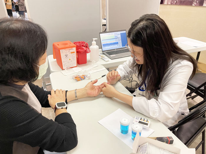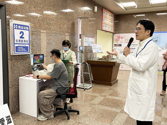 新光醫院在地下二樓候診區設立捐血報到及登記處,進行證件查驗、填寫健康問卷及生理量測。