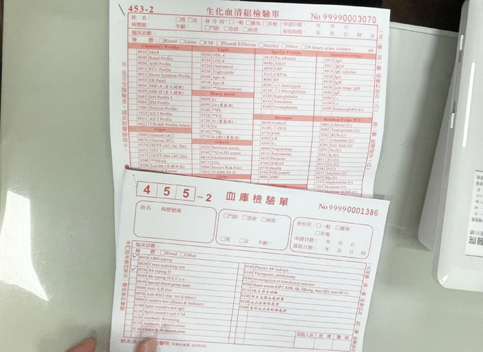 醫院內部捐血作業啟動後,除簡化血液檢檢項目外,也準備紙本檢驗單。