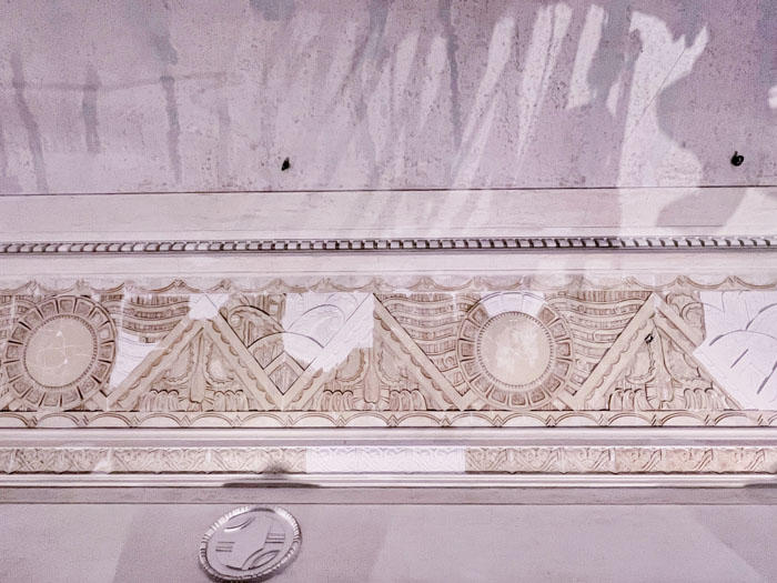 大廳天花板四周的飾板可看出修復痕跡,這是特意要讓遊客了解修復古蹟不一定非得「修舊如舊」,留下自然的痕跡也是一種方法。