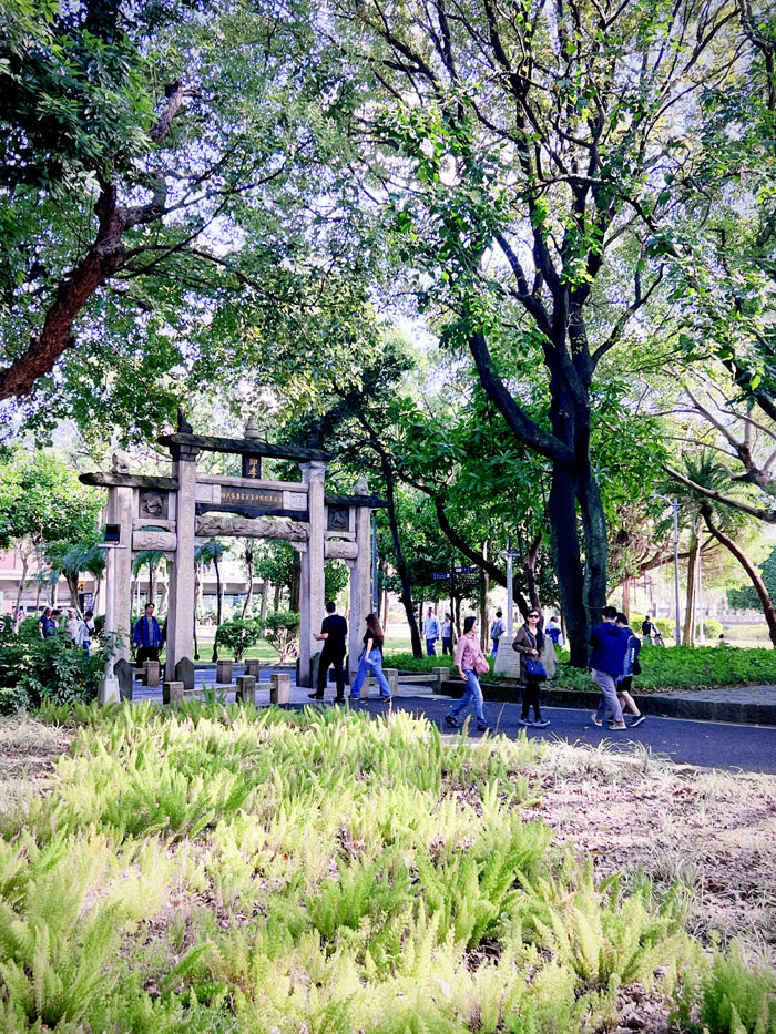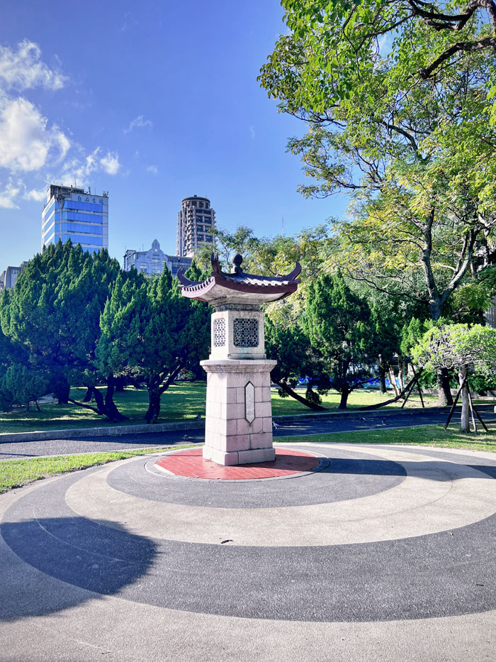 二二八公園福德廟、急公好義坊、清代台北府衙門前的石獅和露天音樂台在公園的一隅形成了一個有趣卻又和諧的畫面。
