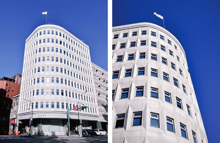 在藍天的映照下,亞洲水泥大樓優雅卻又有氣勢的身影特別美麗。這座臺灣第一棟帷幕牆建築,每一扇窗的角度、甚至轉角的弧形,都是王大閎設計師精準設計的巧思與風格,優美而雋永。