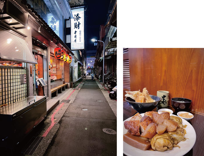 在城隍廟旁的小巷裡,有一家近七十年的日本料理店「添財」。周邊的城隍廟、城中市場與沅陵街商圈,都是許多人成長中的生活記憶。添財提供的是帶有台灣味的日本料理,招牌關東煮色深味厚,蘿蔔、蒟蒻與高麗菜捲煮得軟透入味,搭配特製味噌醬更添風味。天丼、蛋包飯、生魚片、壽司、牛蒡炒肉絲等菜色,是老一輩熟悉的家常味道,也展現三代傳承的堅持。