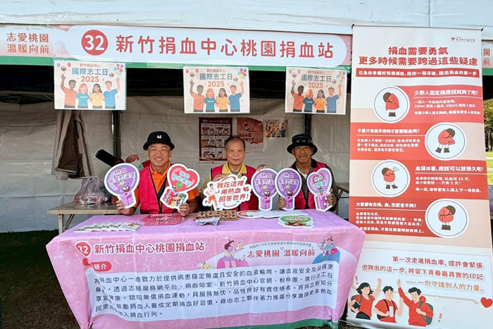 新竹捐血中心則由吳宏驥志工隊長親自帶領,志工夥伴們精神抖擻,在專屬攤位積極推廣捐血觀念宣導。透過實地參與,志工團隊不只展現平日默默耕耘的熱忱,也以行動回應,展現志願服務的價值。