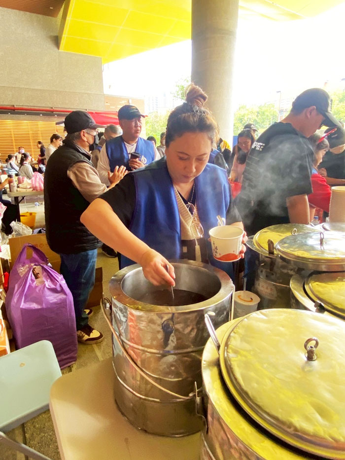 熱排骨湯、麵線、芋頭粥與甜湯讓完成捐血的民眾在寒冬中感受溫暖與關懷。