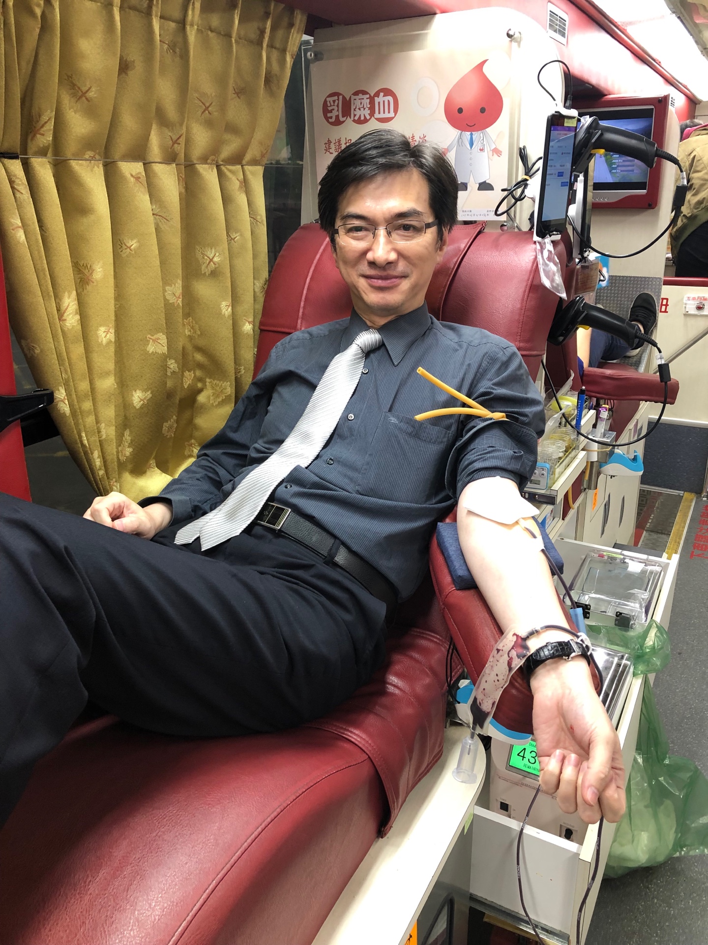 台灣的捐血事業享譽國際,身為醫生,除了致力輸血醫學外,也身體力行,加入捐血的行列。(107年12月12日攝於新竹捐血車上)