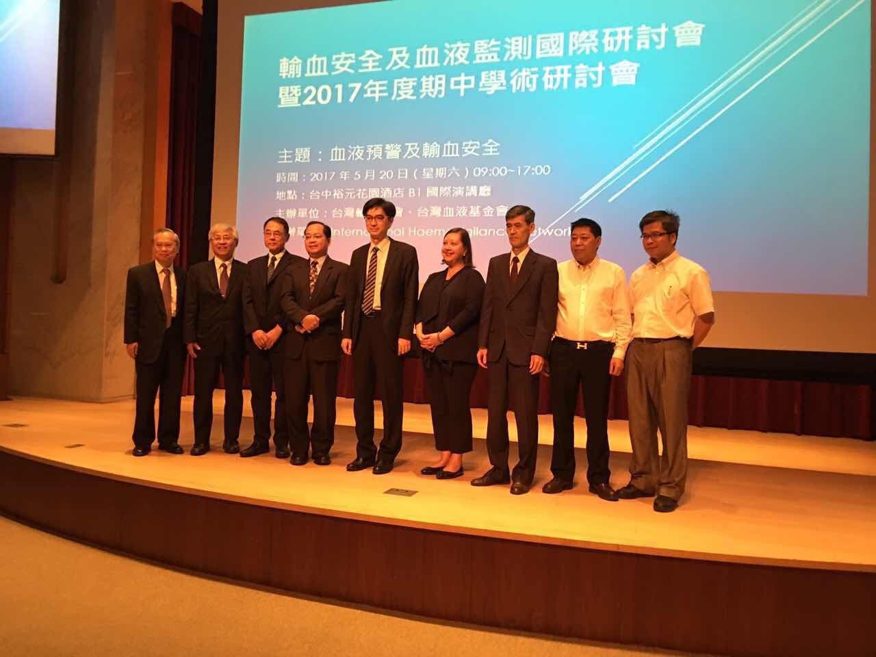 106年5月20日,於台灣舉辦的「輸血安全及血液監測國際研討會暨期中研討會」中與IHN主席Erica Woods(右四)合影。