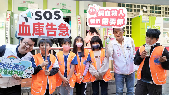 五寮國小同幼社的社員們手拿舉牌穿梭於三峽老街宣傳捐血。