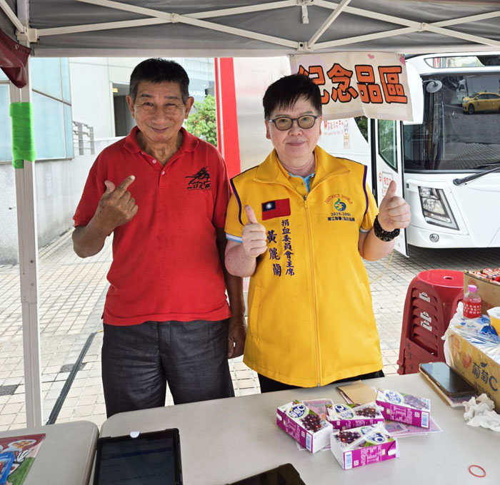 國際獅子會300E-2區捐血委員會黃麗蘭主席(右)在活動現場親力親為,為捐血人服務。