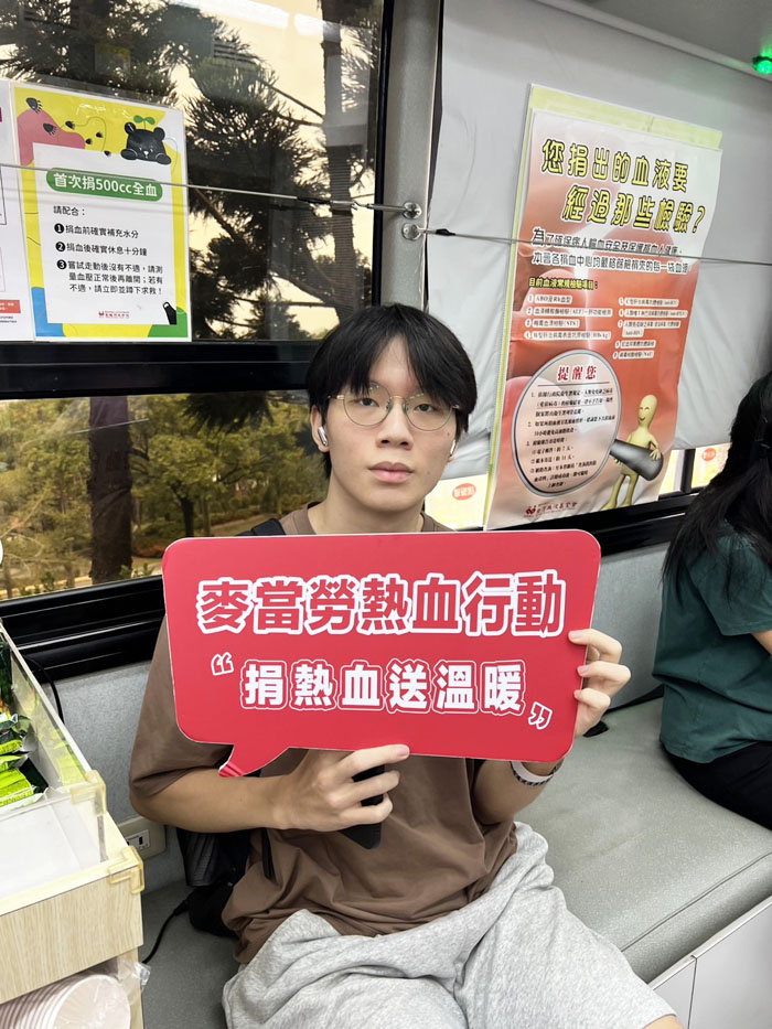 為了讓更多年輕人了解捐血的重要性,在大專院校舉辦的捐血活動,特別與麥當勞合作,熟悉又親切的品牌形象,為現場增添年輕與活力。捐血車開進校園,讓學生在課堂與生活之間,就能以一個簡單行動,傳遞一份大大的愛。