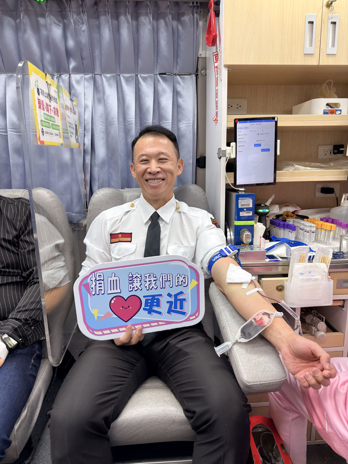 嘉義市消防局副局長李宗儒親自挽袖捐血,帶動消防人員與市民踴躍參與。