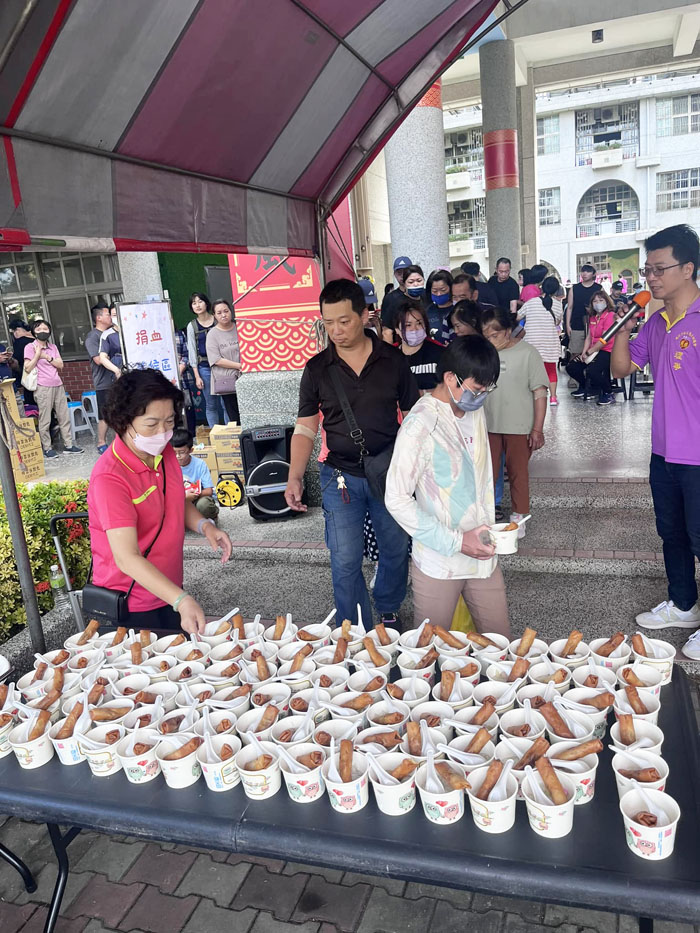 活動現場發放鹹粥與炸春捲,供捐血人補充體力。