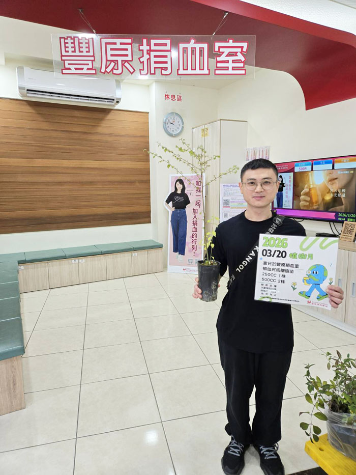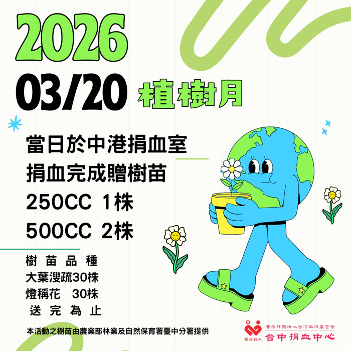 台中捐血中心於今(115)年3月20日,在中港捐血室與豐原捐血室同步舉辦「2026植樹節-捐熱血送樹苗活動」,以實際行動響應植樹節精神,結合環境永續與捐血,號召民眾在守護自然的同時,也一同守護生命。