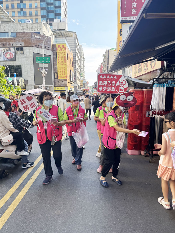 林麗蓉護理師(左1)於志工服勤時,在商圈活動中舉牌宣傳、主動邀約民眾捐血。