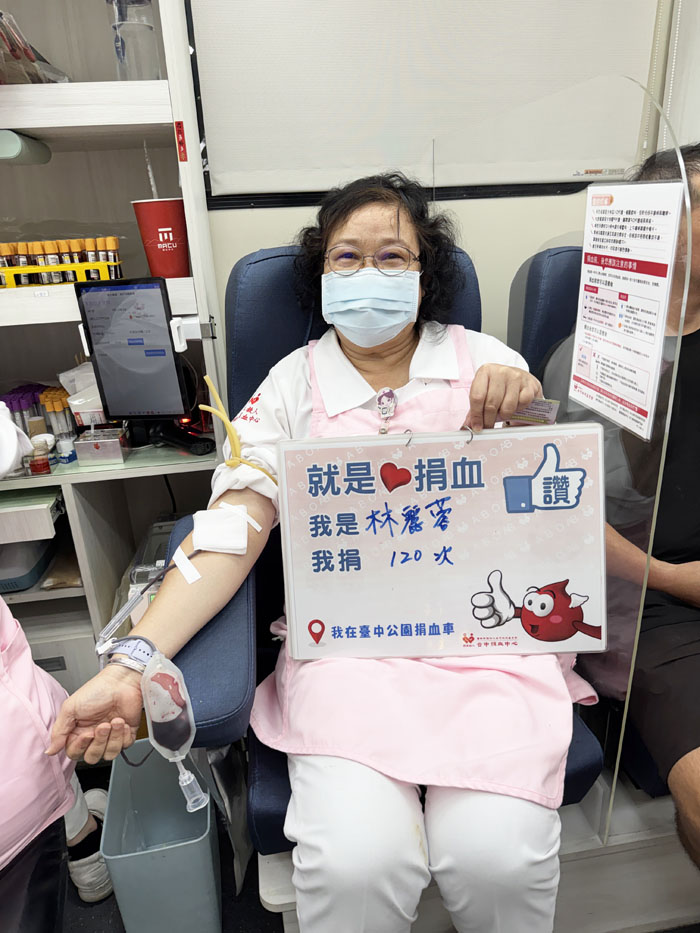 不論是在台中公園捐血車,或如今奔走各地的外出捐血車,她始終站在第一線。用專業守護熱血,並親自成為熱血的一份子,讓捐血工作得以穩定推進,也讓更多生命因此延續希望。