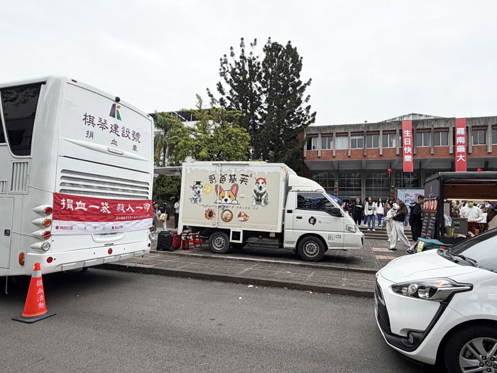 在大禮堂廣場前,除了捐血車,現場還安排了文創小市集,舞台上有同學們精心準備的載歌載舞表演,充滿青春活力的歌聲與舞姿,讓整個校園都沸騰起來。