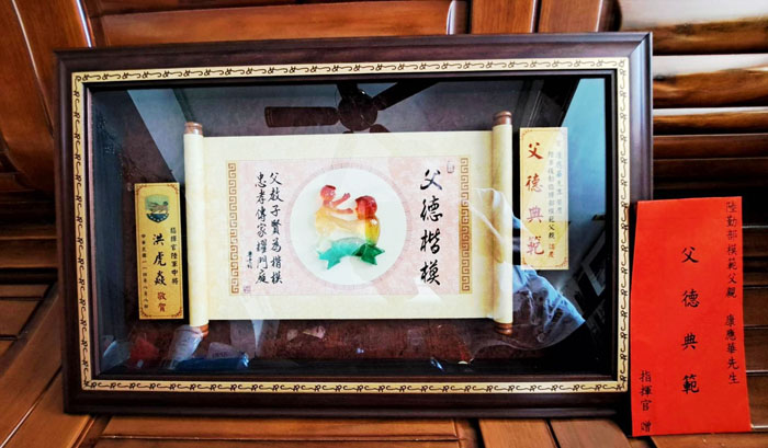 康應華家中客廳的「榮譽區」擺放著許多他引以為傲的榮耀。其中,兒子向服務單位「國防部陸軍後勤指揮部」推薦而得的「模範父親」獎牌,是他無比珍惜的收藏之一。(照片提供/康應華)
