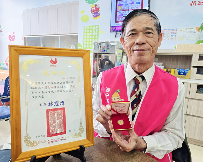 在台中捐血中心114年度的「樂齡捐血人感謝聯誼會」上,有個滿懷熱情的身影。他不僅帶來自己捐血多年的紀念照及所獲得的獎狀,還有平日在台中各地擔任志工,以及家族聚會的相簿等,來這裡與所有捐血人分享交流。