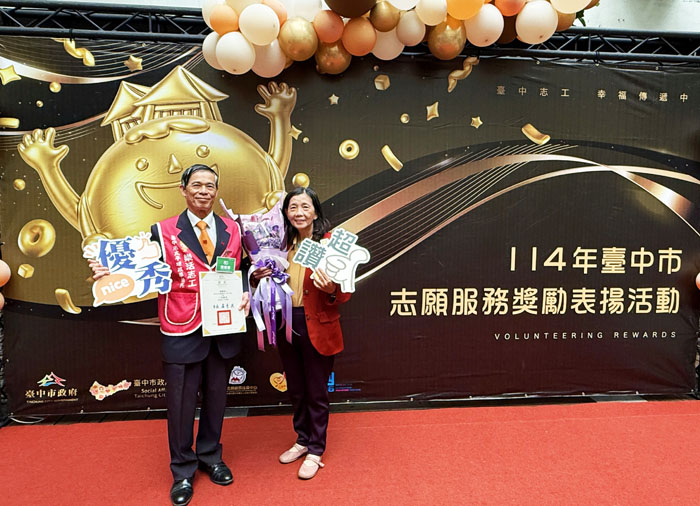 退休後,康應華一週中有大半時間都在各地擔任志工。114年度,他於「台中市志願服務獎勵表揚活動」中,累計服務時數達2221小時,獲頒「服務績優志工」。圖為頒獎典禮後,康應華(圖左)與妻子在現場合影留念。(照片提供/康應華)