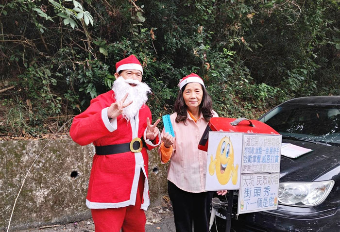 平日擔任志工之餘,康應華(圖左)與妻子也會四處遊賞。圖為在台中大坑步道上,供街頭藝人與民眾現場一展歌喉同樂的區域,康應華穿上應景的聖誕老公公裝,與路人和小朋友同樂的紀念。(照片提供/康應華)