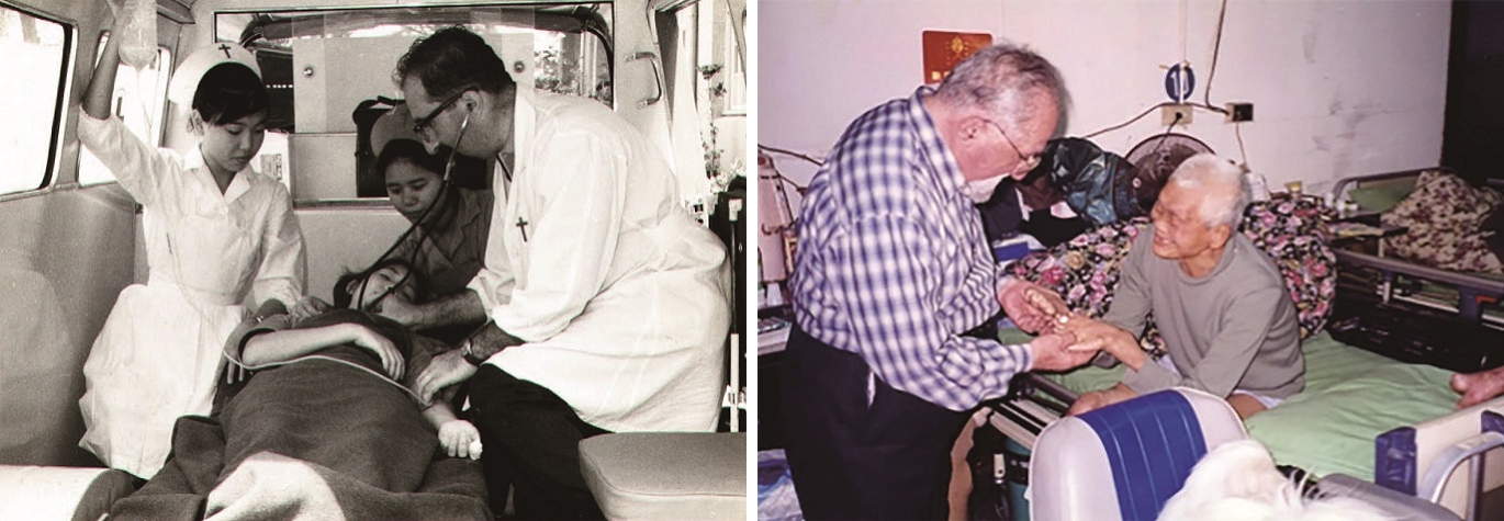 左圖:何義士修士巡診,於醫療車上診治病人。右圖:何義士修士到病人家中為病人診治。(照片提供/靈醫會)