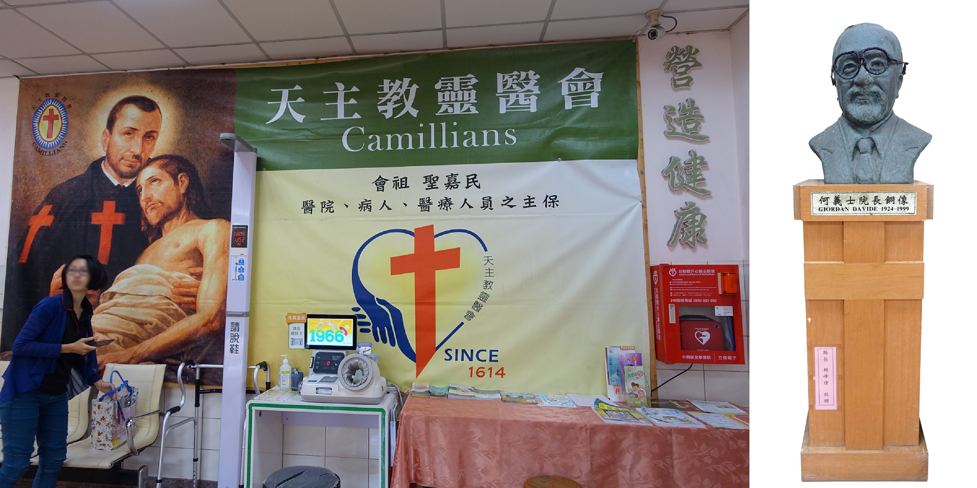 惠民醫院大廳,不忘靈醫會會祖聖嘉民最初的使命,以及一旁的何義士院長銅像。(杜文靖攝)
