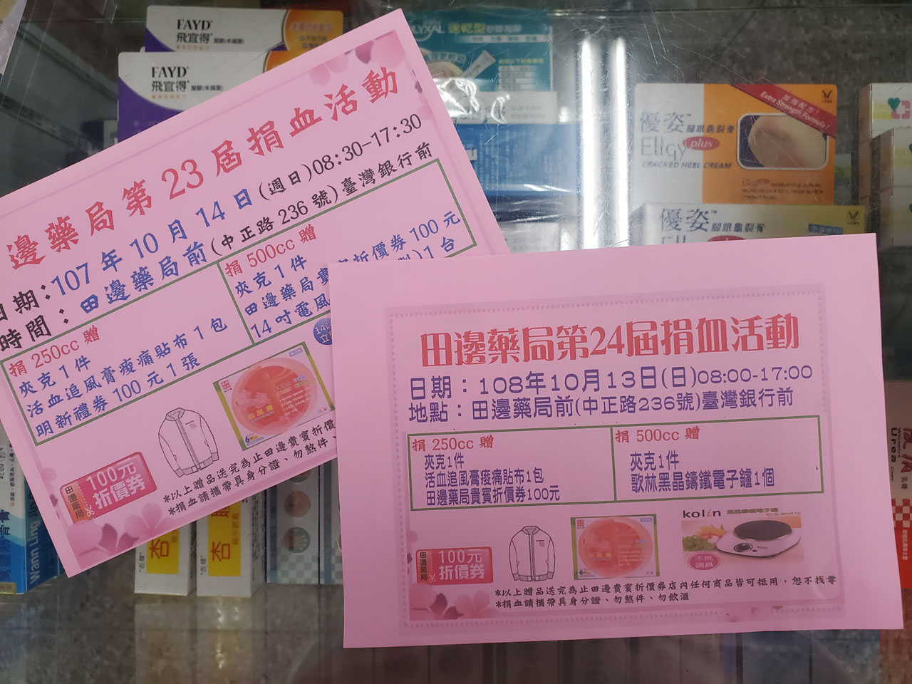 藥局結合捐血活動,感覺相當有趣也無違和,只是舉辦捐血活動通常以大型社團或連鎖企業為號召,比較少個人或店家單獨舉辦,畢竟舉辦一個捐血活動需要大量的人力及資源,若能辦個一、兩年就已經很厲害,沒想到田邊藥局一辦就是24年,共募集了一萬多袋的鮮血,造福無數人。