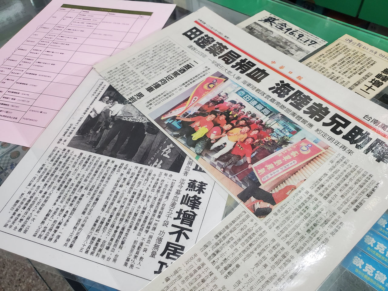 在蘇峰增的辦公桌裡,有著一疊厚厚的文件袋,裡頭都是護貝過的報章雜誌報導,也有部分團體的感謝狀。一張張泛黃的報導剪報記錄著他的募血活動不間斷,一