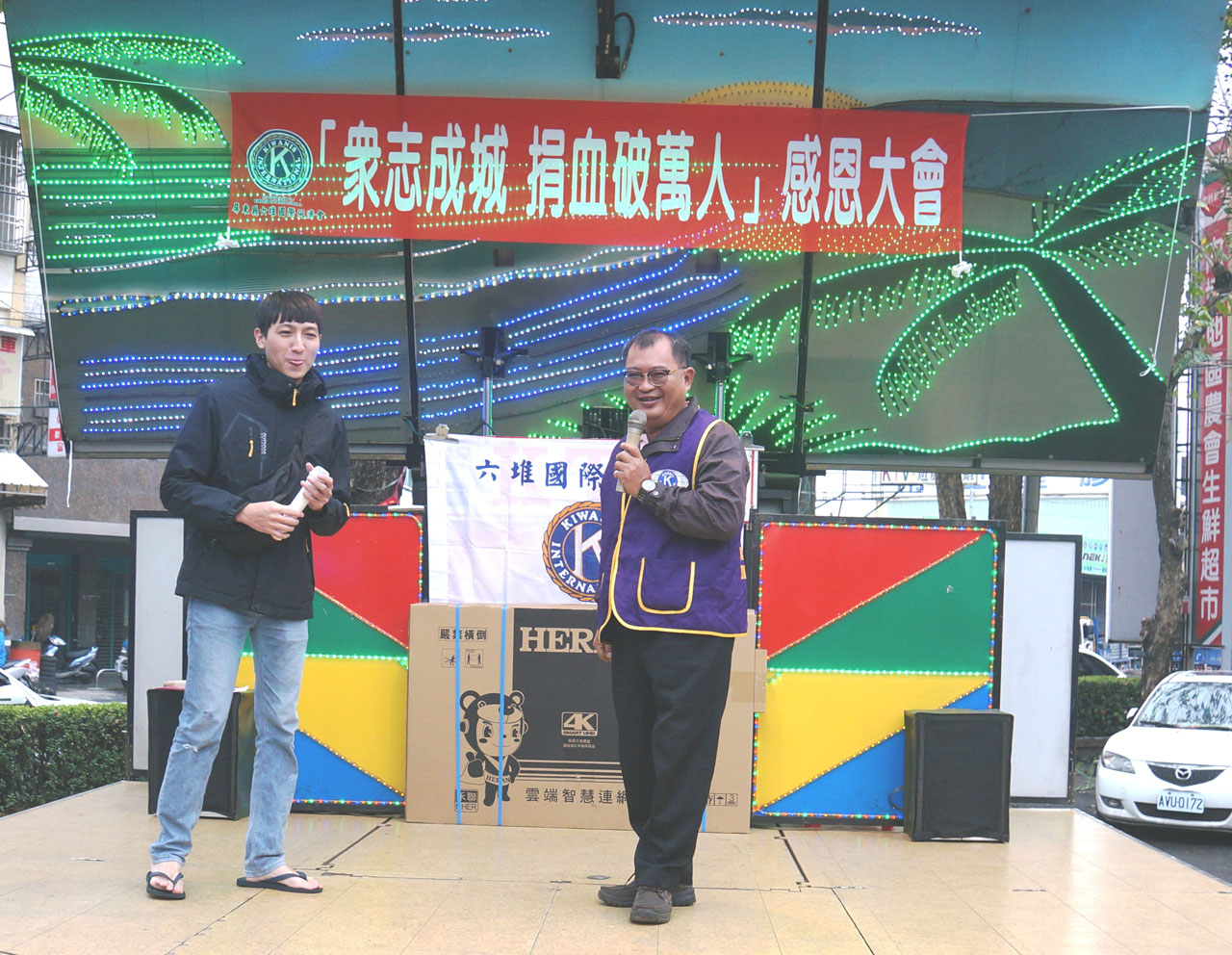 六堆會以「眾志成城,捐血破萬人」感恩大會舉辦慶祝活動,活動現場主持人就是捐血活動開創人鍾國雄(右),上午10點56分,謝皓哲(左)成為六堆同濟會舉辦捐血活動的歷史上第一萬名勇士。