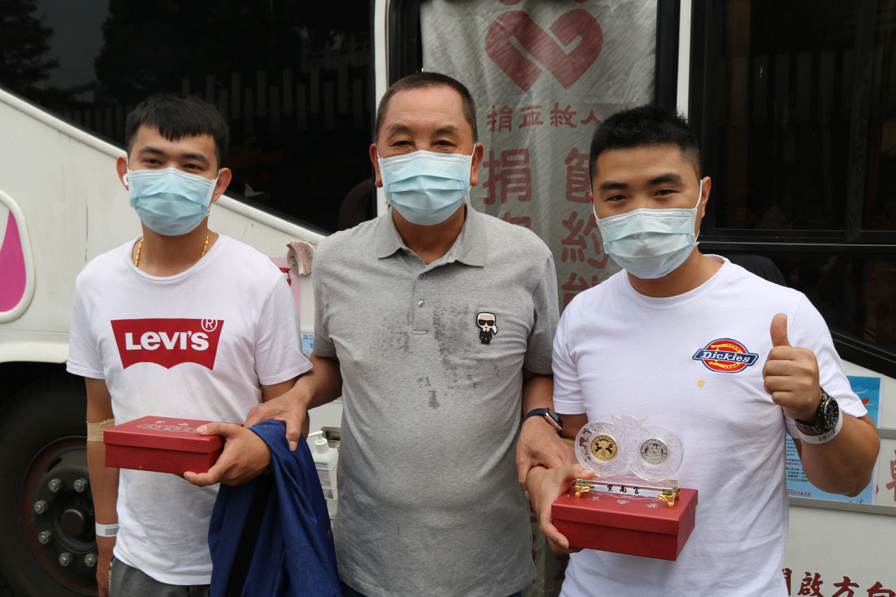 紫南宮主委莊秋安親送典藏組套幣給捐血五百西西最早來捐血的彰化黃先生(右)與王先生(左)。