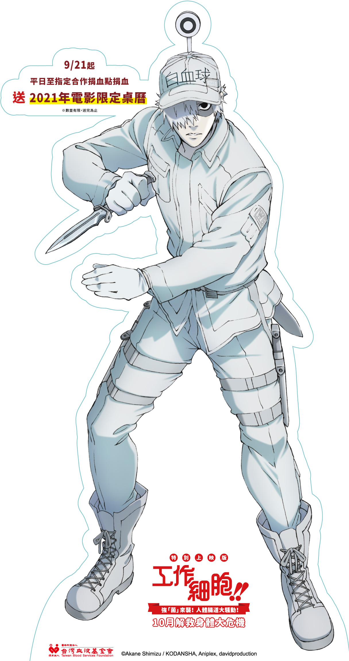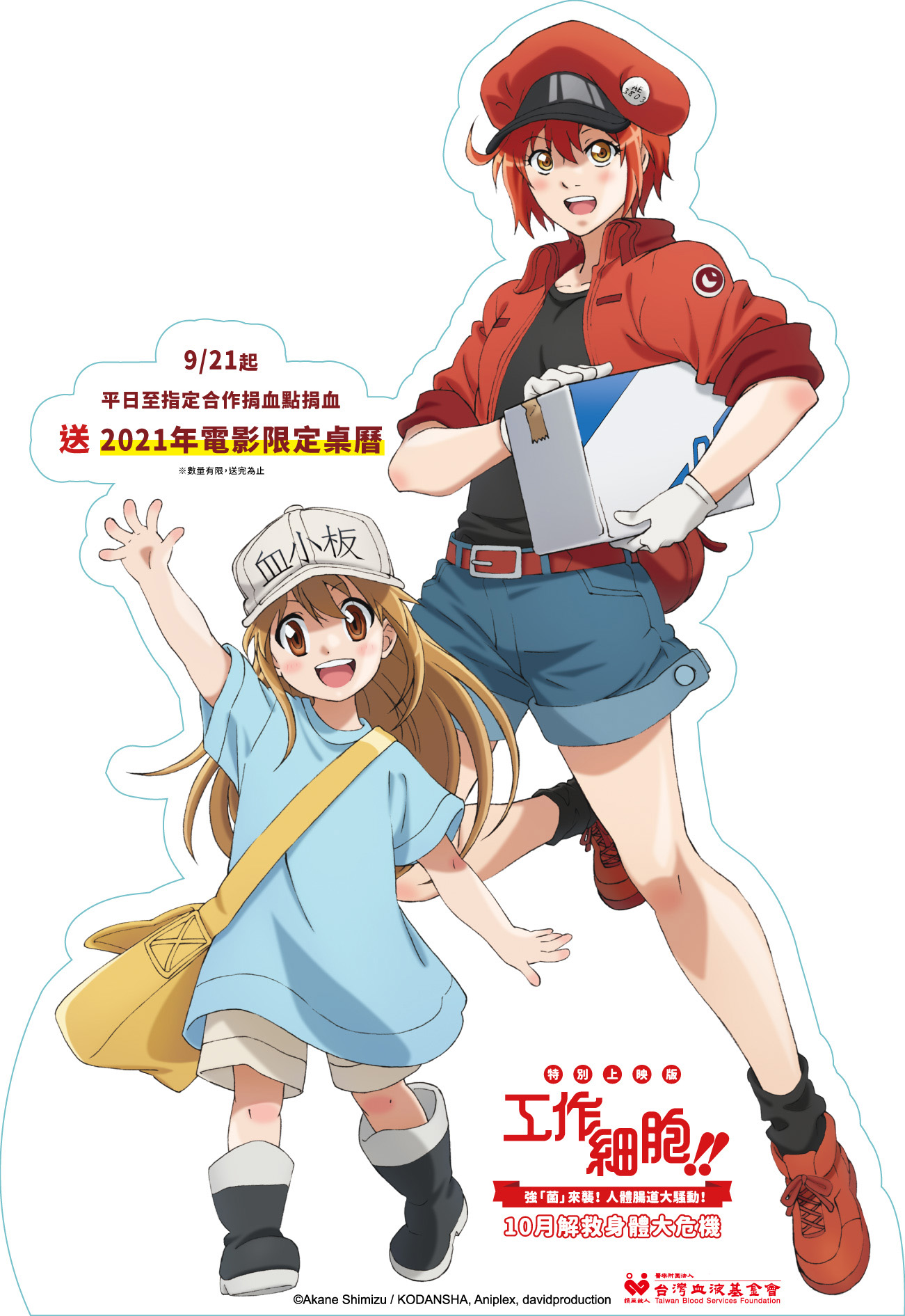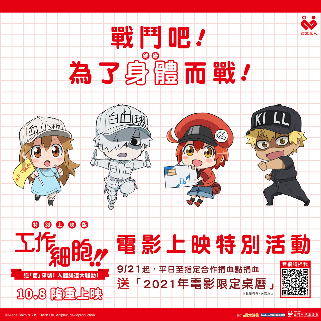 熱襲中、日、台的科普漫畫《工作細胞》,這次在台發行特別上映版《強「菌」來襲!人體腸道大騷動!》,特別為了宣導捐血,在全台有三輛《工作細胞》專車,並為了推動平日定點捐血,自109年9月21日開始,在星期一~星期五於特定地點捐血,即贈送《工作細胞》特製桌曆,獻給滿懷熱血細胞的你!活動據點如下: