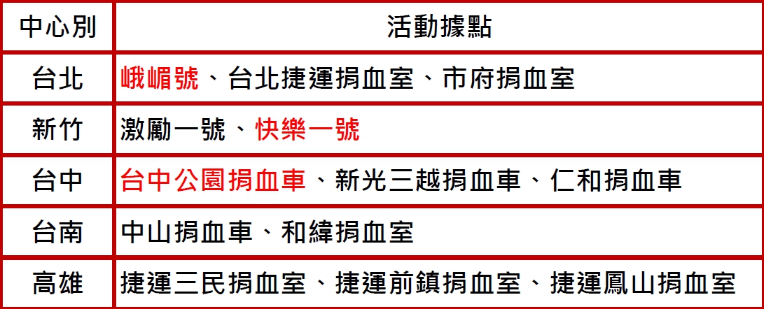 紅字為《工作細胞》專車,歡迎捐完血後打卡分享,召喚更多的熱血細胞!