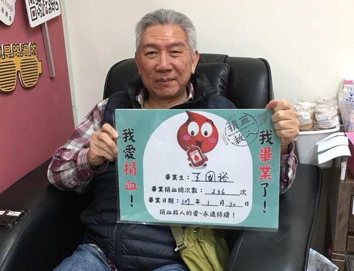 今年8月即將滿70歲,因年初做了全身身體檢查需要暫緩捐血半年,所以在1月提早畢業,最後捐血次數達到236次。如今捐血旅程畫下句點,雖然心裡有許多不捨,他說,只要有空還是會到捐血室走走,看看老朋友,幫忙宣導捐血的好處,讓捐血救人的觀念延續下去。