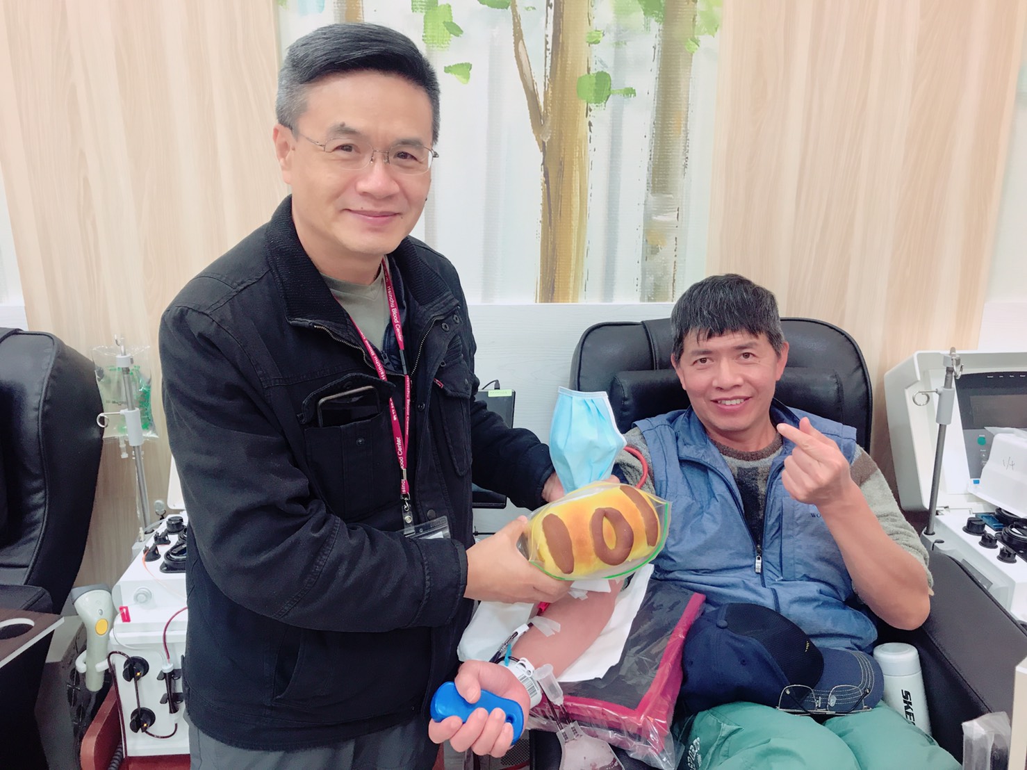捐血人林祺逢捐血101次,自製101次吐司為自己留下紀念,新竹捐血中心寇崇德醫師與其合影留念,感謝他長期支持捐血公益。