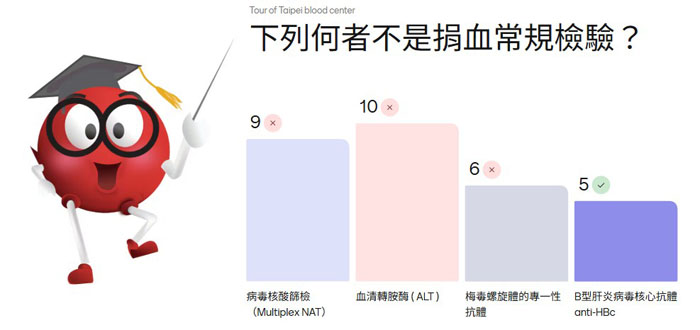 為了讓大家在輕鬆的氛圍下開啟旅程,一開始先安排了「捐血知識小測驗」。5個互動式的專業考題,伴隨著節奏輕快的音樂,讓學生在歡笑中初步掌握捐血流程的關鍵重點,為接下來的行程暖身。