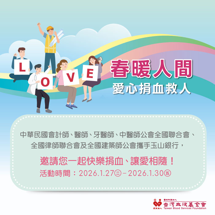 為緩解農曆年關將近的缺血問題,玉山金控與中華民國會計師、醫師、牙醫師、中醫師公會全國聯合會、全國律師聯合會及全國建築師公會寒冬送暖,連續9年共同舉辦「快樂捐血 讓愛相隨」捐血活動,於1月27日至30日在台北、新北、桃園、新竹、台中、嘉義、台南及高雄等地區展開,在全台31個捐血點,合計有3,862位捐血者熱情響應,共募集到5,792袋熱血,傳遞愛與幸福,幫助年節假期血庫儲備,讓病患能安心治療。