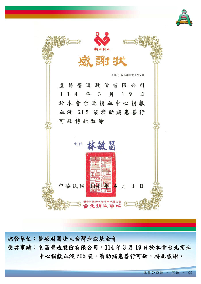 多年來,豐鑫皇昌集團積極投入捐血公益行動,並多次台灣血液基金會肯定。豐鑫皇昌集團相信,企業的影響力不僅體現在工程成果與技術實力,更來自於對社會的長期關懷與投入。